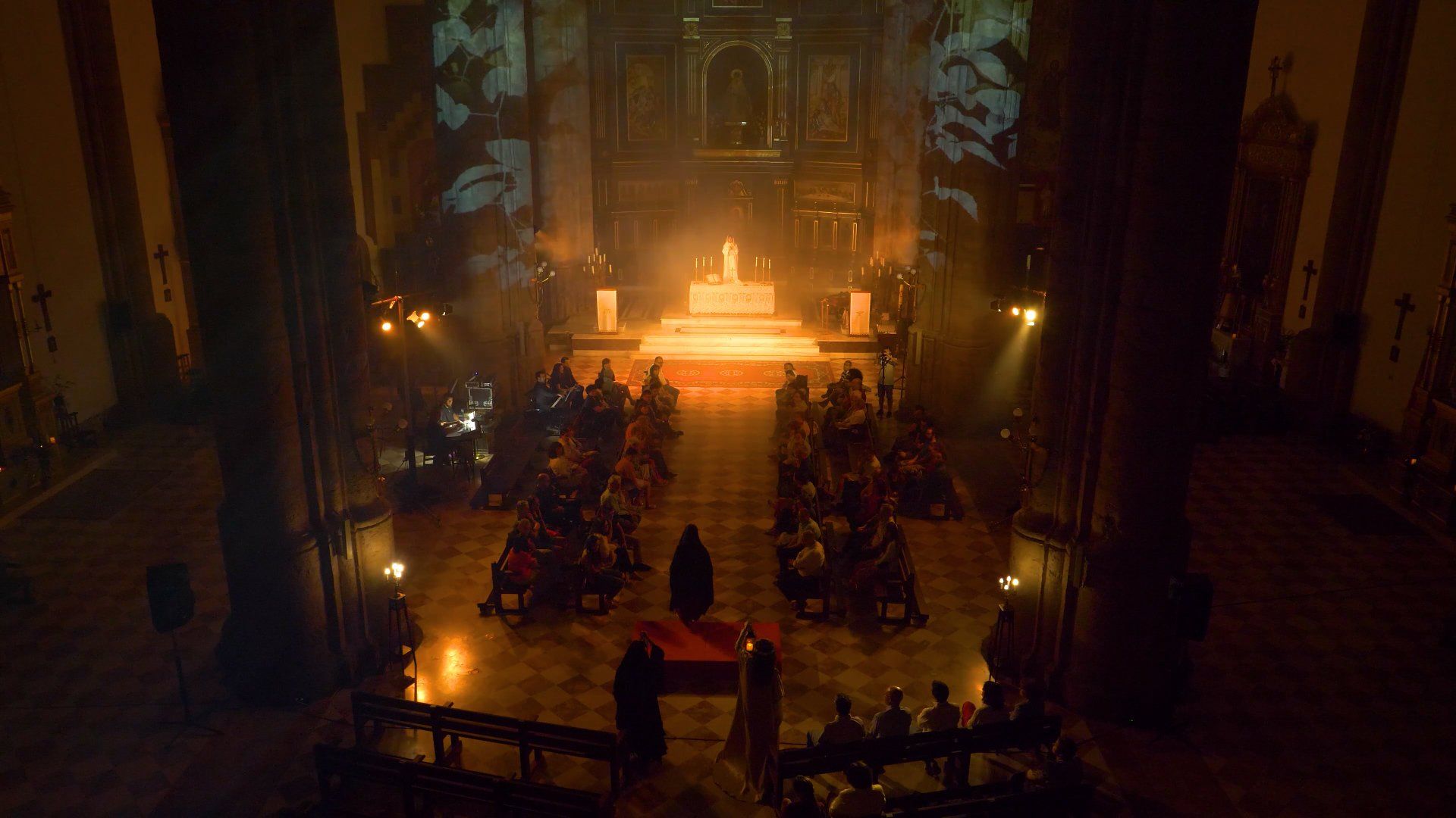The Auto-Sacramental "The secrets of the Mass" by Calderón de la Barca allows us to make a poetic approach to the events of the Last Supper. The La Morada theater company, using a highly visual and symbolic language, helps us understand these mysteries. The enveloping and sacred music of the Portuguese choral ensemble Cardo-Roxo with the themes of their work "No monte das Oliveiras", accompanies us on this timeless journey. From the beginning of this work, we wanted art to be the narrative vehicle, of the complexities that are hidden and treasured, in each gesture and word of that Dinner that would change the world.